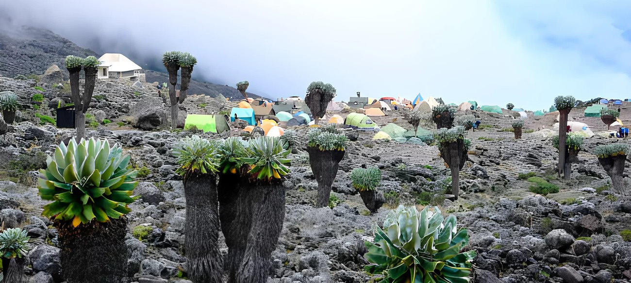 After a good night’s sleep and a hearty breakfast, we emerge from the rain forest and continue on an ascending path, crossing the valley along a steep rocky ridge. The route now turns west onto a river gorge until we arrive at the Shira campsite. Temperatures begin to drop.